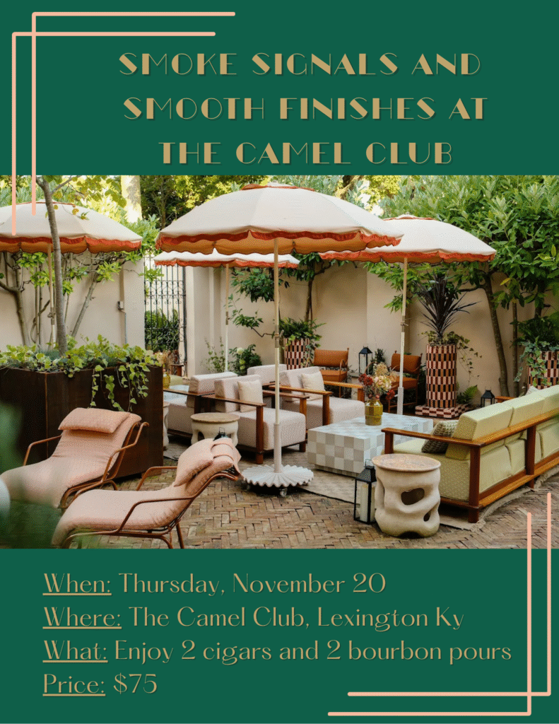 We’re teaming up with The @camelclubky for a night of bold bourbon and beautiful cigars – and you’re invited! Sip on two carefully selected bourbon pours while enjoying two premium cigars, all paired to perfection and guided by our very own cigar aficionado, @adamkohn.