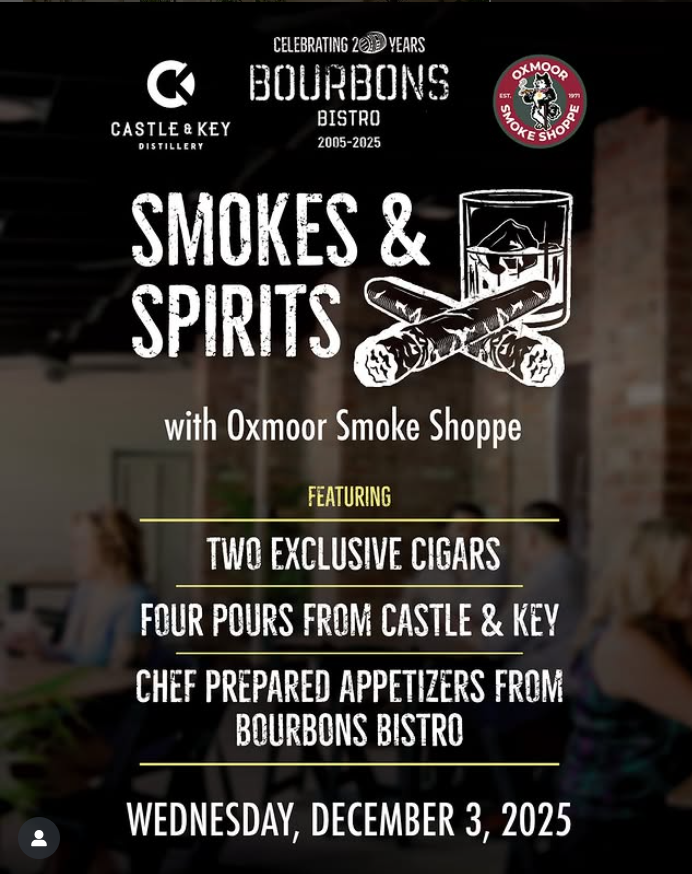 Join us on Wednesday, December 3, for an evening of fine cigars, elevated spirits, and exceptional food pairings at Bourbons Bistro with our friends from Castle & Key and Oxmoor Smoke!